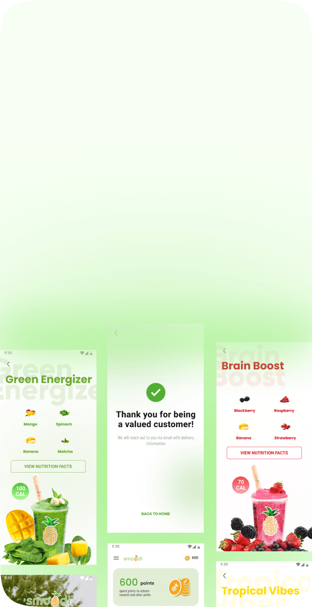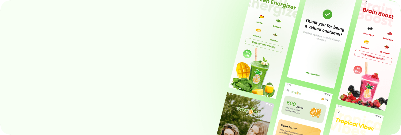 Smoodi's all-in-one loyalty app for customers to earn points, redeem them for exciting rewards, and explore a variety of smoothie flavors.